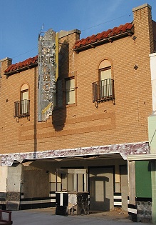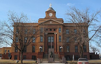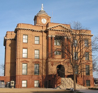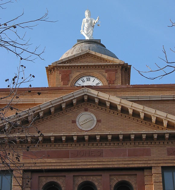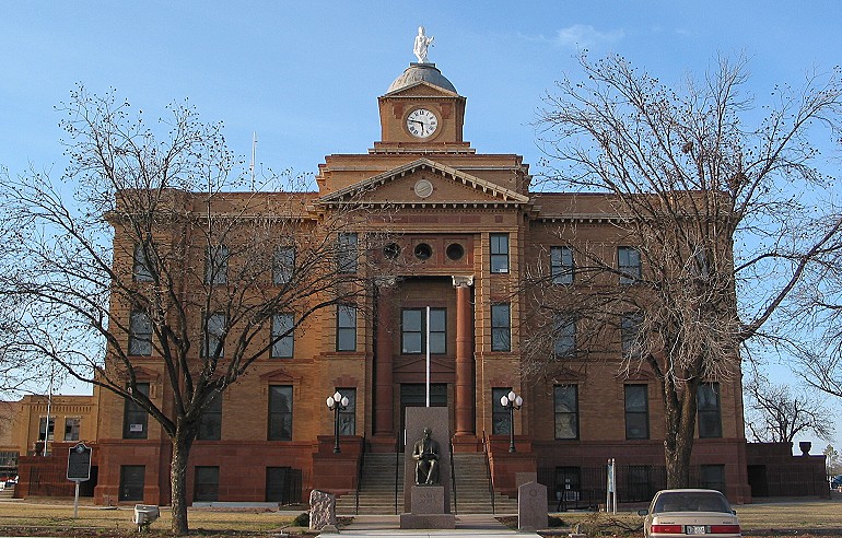 The setting sun brings out the colors of the brick and Pecos red sandstone on the west side of the courthouse. |