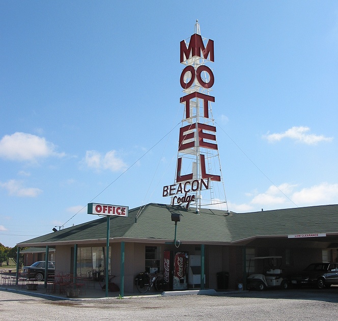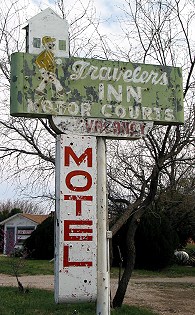 The Travelers Inn is in disrepair, but the sign still stands. |