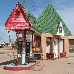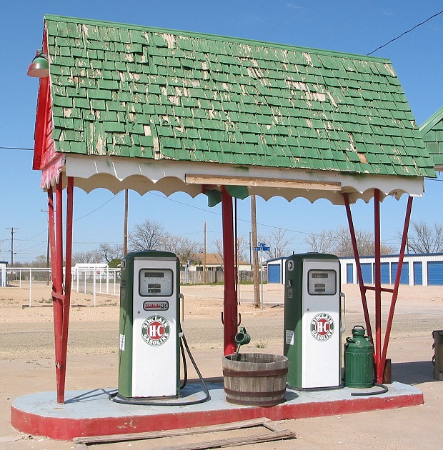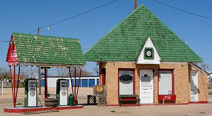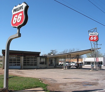 This Phillips station looks like it was frozen in time, complete with older-style pumps and a full service island beneath the flying vee canopy. |