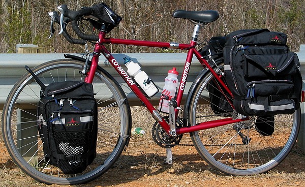 I love this bike! Everything is just right. It feels good, it rides great, and it took me all the way across America with nary a complaint. Better known for their tandem bikes, Co-Motion made the wise decision to incorporate their heavy duty tandem tubing into a single bike for loaded touring. They also had the intelligence to give it the proper gearing straight from the factory, unlike most "touring" bikes. Although this was a custom bike, the only change I made from their standard offering was to switch from bar-end shifters to STI, Shimano's integrated shifting and braking levers. With stock equipment like a Chris King headset and an XTR rear derailleur, why change anything else?