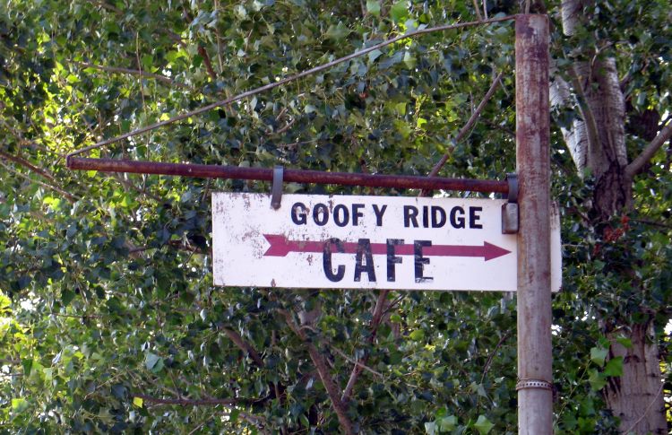 There isn't a sign for the town of Goofy Ridge, but there is a sign for the cafe.