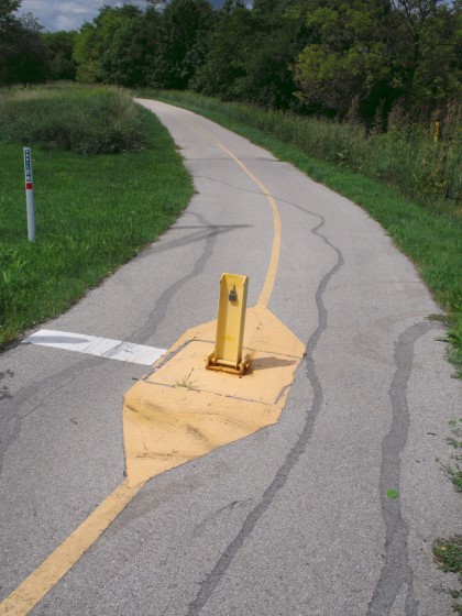 Be careful on trails that have these obsolete and dangerous low barriers. A few  cyclists have severely injured themselves hitting them.