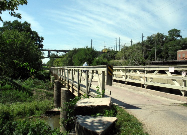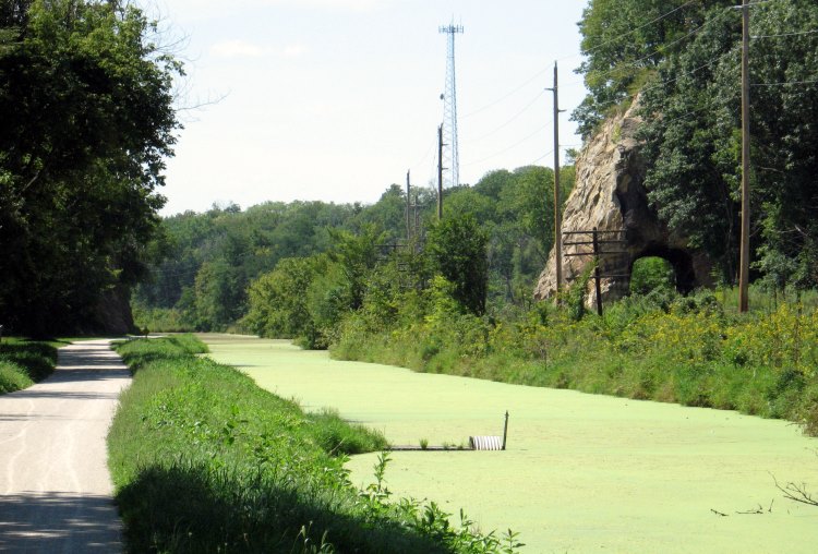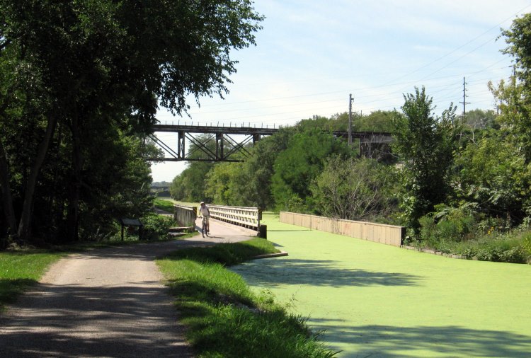 This railroad bridge crosses the trail and the stagnant,  green canal.