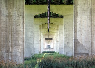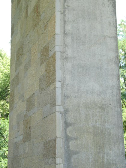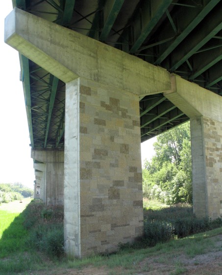 I-39 crosses the Illinois River and the I& M Canal on the state's longest bridge. The supports next to the trail are dressed up with  a stone veneer.