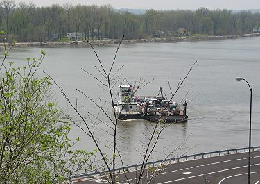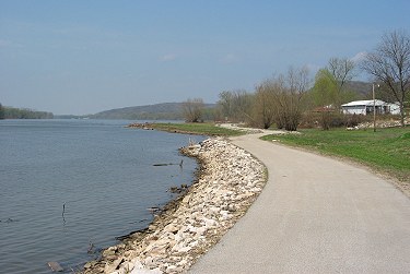 Bicyclists are not allowed to ride IL 100 through Grafton. Riders are directed south, passing behind the town's tourist district. This is the only place where the trail runs along the bank of the Mississippi River: