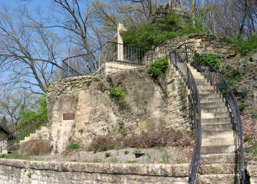 West of Grafton, this cross commemorates the point where in August 1673 Marquette and Joliet first entered what became Illinois: