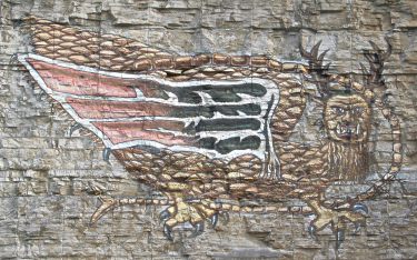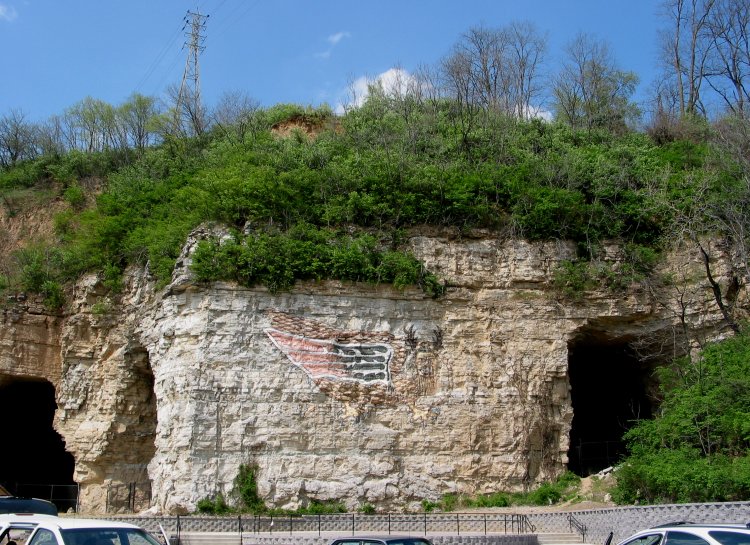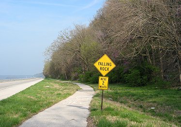 The bikeway runs along the IL 100 shoulder through Alton, but I chose to start on the west end of town at Piasa Park. The city had recently paved a parking lot there and was constructing toilet facilities. The "Piasa Bird" is a painting on the side of a cliff that vaguely imitates an Indian cliff painting of a river monster. Marquette and Joliet saw a similar painting (but not the monster itself) on their legendary journey along the Mississippi and Illinois Rivers. Marquette's description, however, does not mention wings: