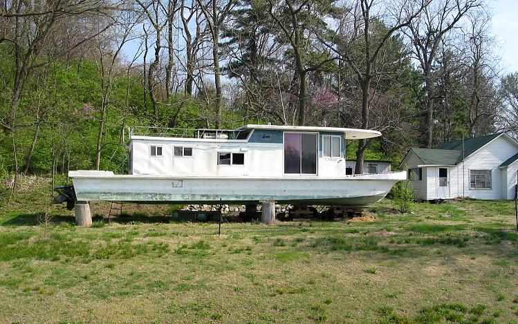 When I took the photo above, I discovered that I had room for only a dozen photos on my camera's memory card. I hadn't packed an extra, and I didn't feel like riding back to the car for one. I went through yesterday's Hillsboro-Roubaix photos and freed enough space for a total of twenty pics. I would have to be more judicious than usual. Regardless, I couldn't pass up a photo of this landlocked houseboat ready and waiting for the Mississippi's waters to rise: