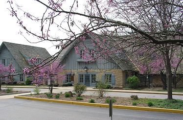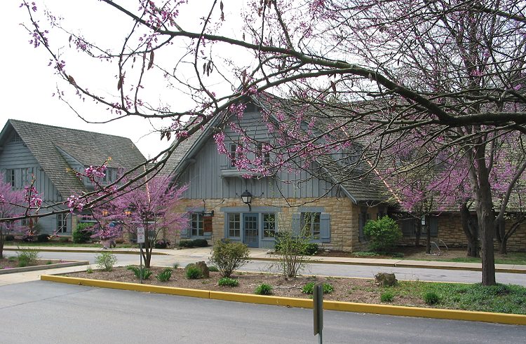 The path gets away from the highway a bit for two miles, becoming hilly and curvy. The trail is littered with leaves, branches, sand, and rocks, but wooden fences prevent cyclists from tumbling into ravines. I turned around at Pere Marquette State Park. The park's lodge was built by the Civilian Conservation Corps during the Great Depression: