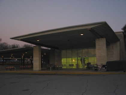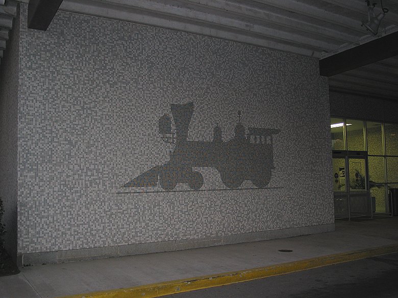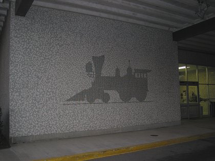 A tile mosaic of an old steam engine on the side of the Savannah train station. |