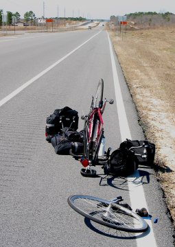 This was the site of my first flat tire of the trip. I was lucky to have the wide shoulder and bike lane, since SR 96 narrowed at the bottom of the hill (eventually, when the road is four lanes throughout, I think all of SR 96 will have bike lanes). Fixing a flat on tour is a big production since all the panniers have to be removed first. |