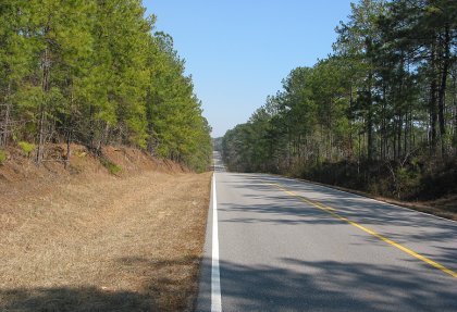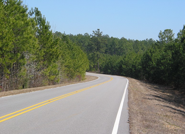 The lightly-traveled road curved through pine forests. |