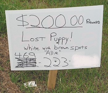 This was one of dozens of signs for Allie, the Jack Russell terrier, that I saw. Each sign had slightly different wording and details  (phone number obscured for privacy). |
