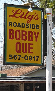 Just when I thought I'd seen every spelling of barbeque, along came Lily's Roadside Bobby Que of Canton, Texas. |