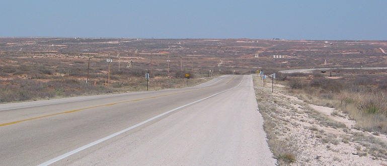 This panoramic view shows lots and lots of oil pumps in the distance. |