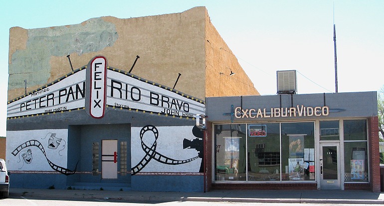 The old and the new: I wondered if the video store rented the movies painted on the Felix Theatre's marquee. |