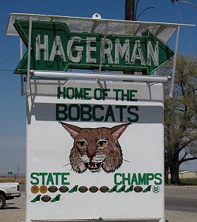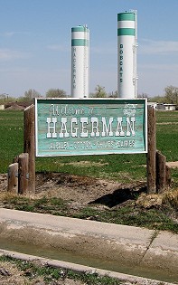 There was an irrigation ditch alongside the road in front of the Hagerman welcome sign, which touts alfalfa, cotton, chilies and dairies. Also note the twin water tanks proudly displaying the high school team's nickname. |