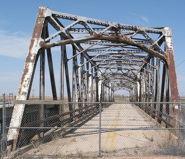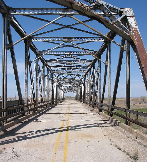 The bridge was preserved when a new one was built just to the west, but it is closed to all traffic. Notice the diagonal beam at the top. |