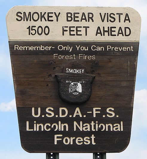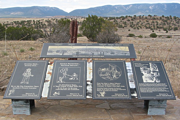 The vista included a series of interpretive signs about Smokey Bear and forest fire prevention. Smokey was found as a badly burned cub near the Capitan Gap. |