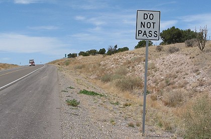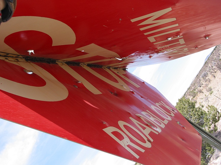 ... yes,  it was a sign to close the road for the military. US 380 skirted the northern boundary of White Sands Missile Range, most famous for the Trinity Site, the spot where the world's first atomic bomb was exploded. The Trinity Site itself was about 20 miles south of the highway. |