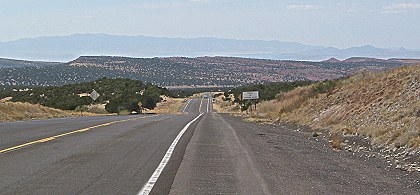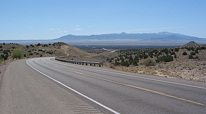 After climbing the Sierra Oscuras, I looked back down US 380, which can be seen snaking off into the distance. Snow-capped Sierra Blanca is visible on the right. US 380 had wide shoulders with narrow bike-friendly rumble strips. |