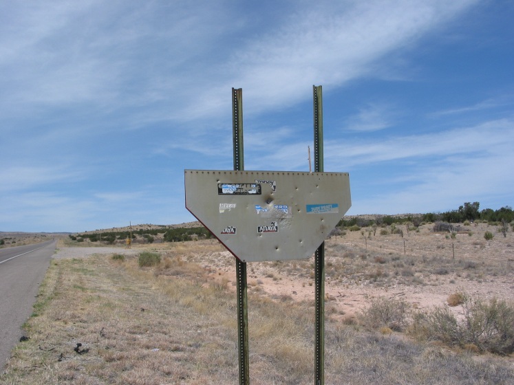 This folded-over  stop sign was in the middle of nowhere by the side of US 380. I guessed what it was for, but I had to peek to see if I was right... |