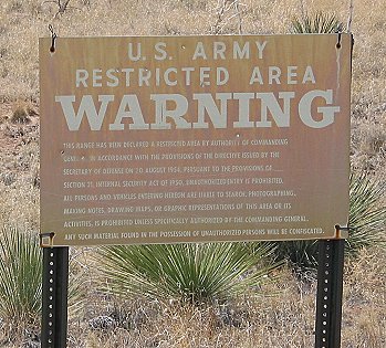 " This range has been declared a restricted area by authority of commanding general in accordance with the provisions of the directive issued by the Secretary of Defense on 20 August 1954, persuant to the provisions of Section 21, Internal Security Act of 1950. Unauthorized entry is prohibited. All persons and vehicles entering hereon are liable to search. Photographing, making notes, drawing maps, or graphic representations of this area or its activities, is prohibited unless specifically authorized by the commanding general. Any such material found in the possession of unauthorized persons will be confiscated." |