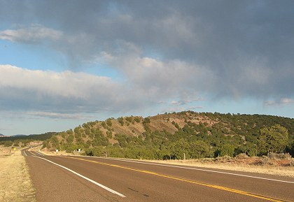 Ten minutes later, I looked back but Pie Town was already gone. On an artistic note, I love the way the sunset-lit highway contrasts with the gray clouds. |