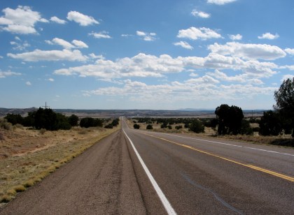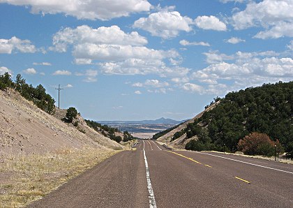Further down the road and higher up, I looked back at Quemado again. After all, it was the only town I would see until I reached my destination of Springerville, AZ about  50 miles away. |