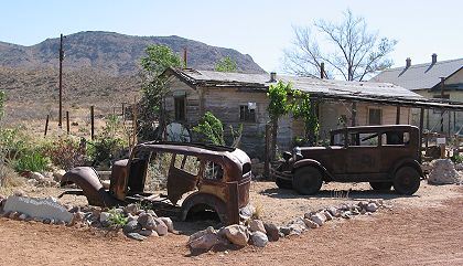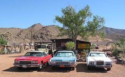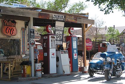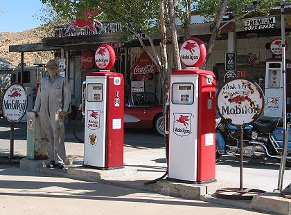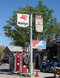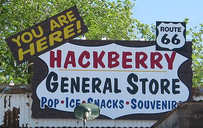 Though neither a functioning gas station nor a Greyhound stop, the Hackberry General Store had signs for both. |