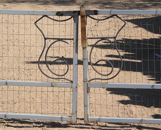 The gate separating the store from the owners' personal area was decorated with a 66 shield sculpted from steel rebar. |
