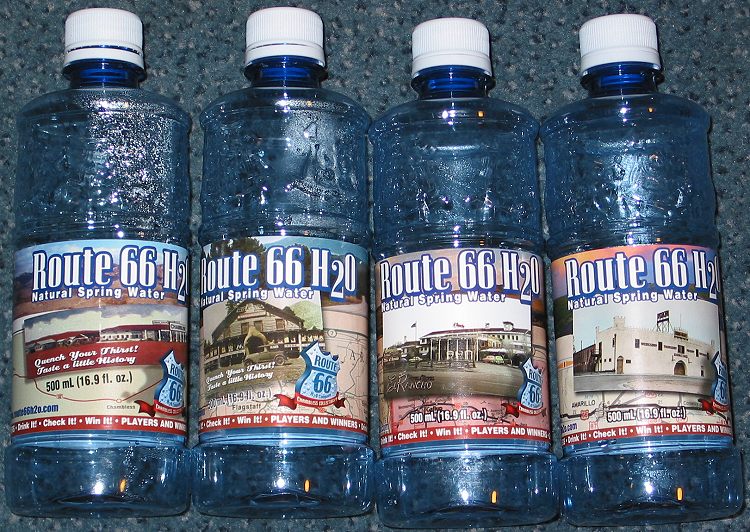 I had been collecting various labels of Route 66 H20 since Seligman. I gave up in Kingman and took a picture of them before tossing them in the trash. |