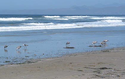 The birds were enjoying the tasty morsels that the waves washed up on the shore. |