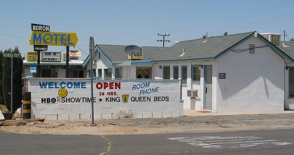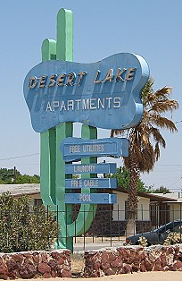 The Desert Lake Motel was converted into apartments. Again, there is my pet peeve: a saguaro in the wrong desert! This was a filming location for the movie Erin Brockovich a couple of years before I rode past. |
