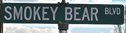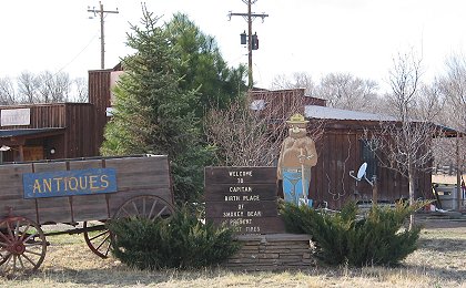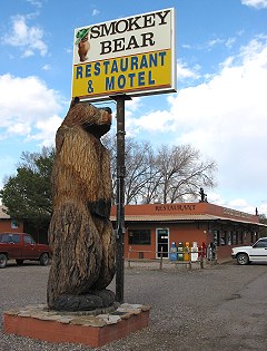 A metal Smokey like the one at Smokey Bear Vista was beside another welcome sign near an antique store. |