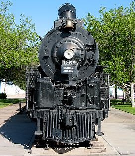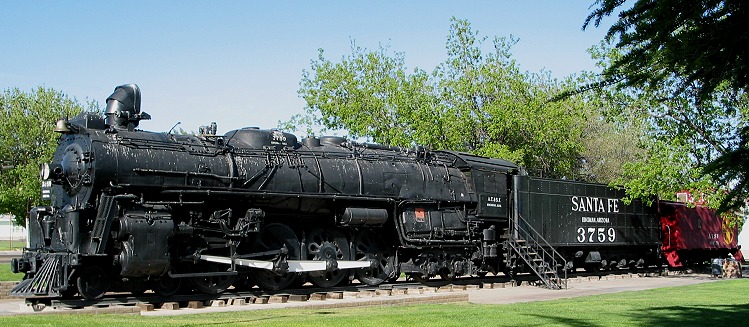There was a Santa Fe locomotive in a park on the west side of town. |