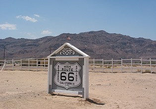 Newberry Mountain looms over this friendly Route 66 sign wishing the traveler a happy 2002. |