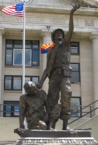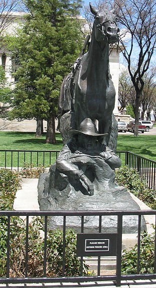I couldn't find any information about this statue on the courthouse square. One might have expected the plaque in front to describe it, but it just said, " Please remain outside fenced area." |