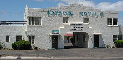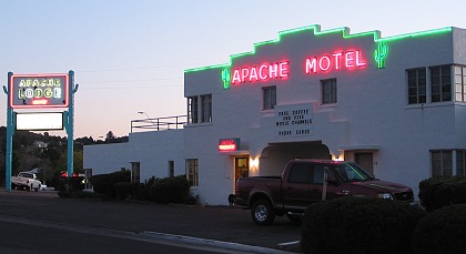 The Apache Lodge was a distinctive old motel. Notice the saguaro cactus style of the sign posts. |