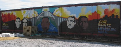 The Civil Rights Memorial Mural was painted on the side of a building facing the park. |