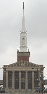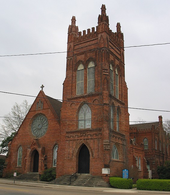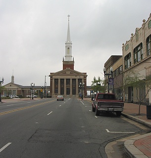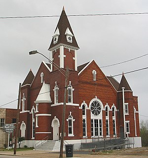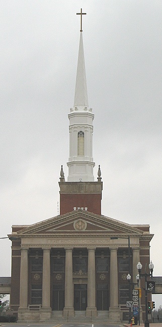 After crossing the bridge from Bossier City, one sees the First Methodist Church South  straight ahead, overlooking downtown from the top of a hill. |
