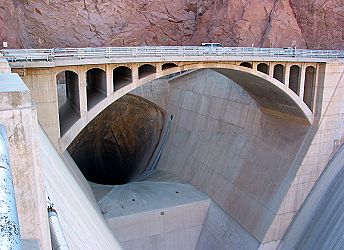 When the level of Lake Mead gets too high, it flows around Hoover Dam through diversion tunnels on either side (not spilling over the top of the dam as some might think). The bridge carries US 93 traffic over the spillway on the Arizona side. |