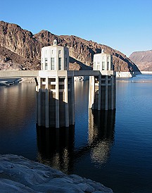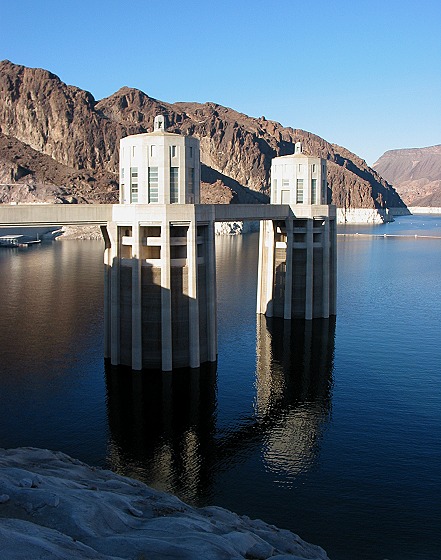 These are two of the four intake towers in Lake Mead that deliver water to the power plant at the base of Hoover Dam. |