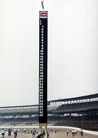 When I crossed the bricks after 19 laps, I announced in my Jackie Stewart voice that the white flag had been dropped, meaning one lap to go. A lap later, I took the checkered flag (figuratively, although it would have been a nice touch to have somebody waving one). According to my cyclometer, I rode 52.5 miles in 2:52:00. I had done 50 miles of track, but the 2.5-mile laps are measured nine feet from the inner white line. All the weaving up and down the banks to pass people added some distance, plus my cyclometer may not have been perfectly calibrated. My average speed had slipped to 18.3 mph after the wind picked up, but I was still happy with my ride. The track would be open for another 90 minutes, but 50 miles seemed like the appropriate place to stop since it was one tenth of the Indy 500. Coincidentally, my speed was about one tenth of the fastest Indy 500 on record (Arie Luyendyk averaged 185.981 mph in 1990), meaning that the elapsed time was about the same.