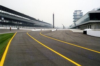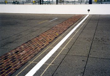The strip of bricks at the start/finish line commemorates the original pavement of the track that earned it the nickname " The Brickyard." |