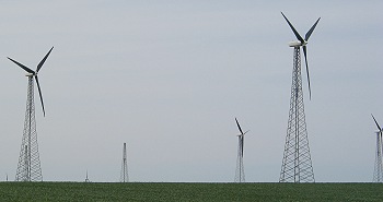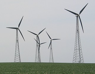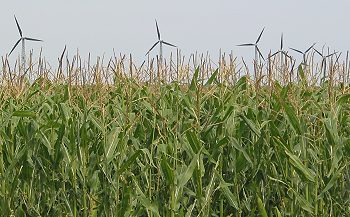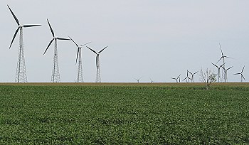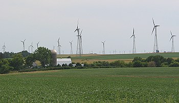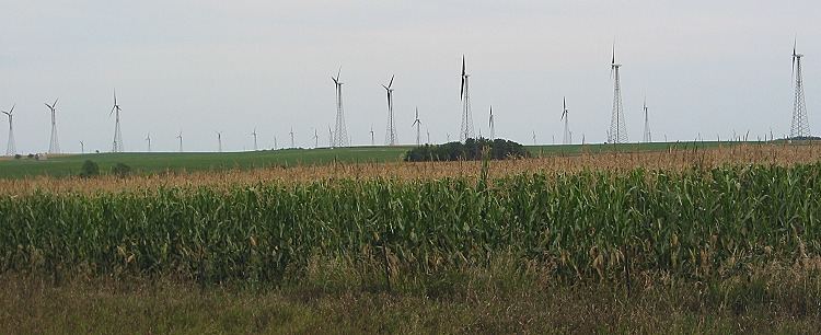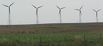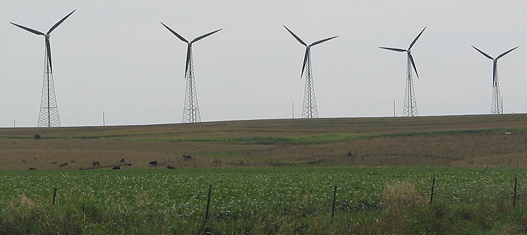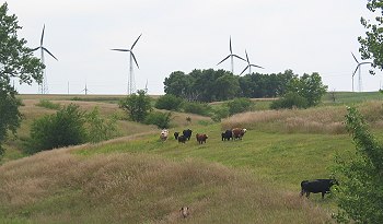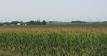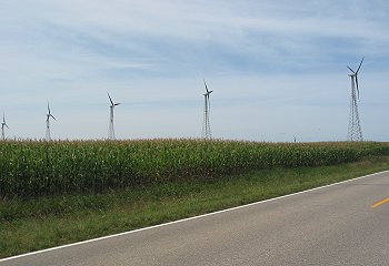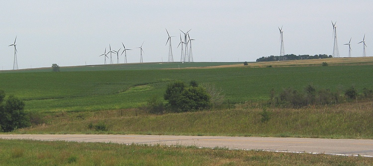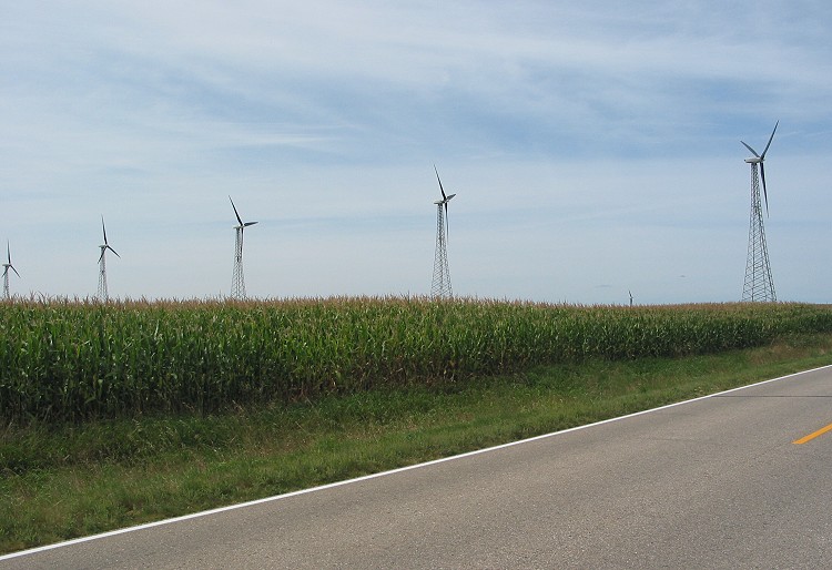 I took advantage of the long Labor Day  weekend to travel to Alta, Iowa to " Ride the Wind on Buffalo Ridge." Buffalo Ridge is a tall pile of glacial rubble that extends northwest from Alta through northwestern Iowa and southwestern Minnesota. Because the ridge is a high point on the plains, it is an ideal location for a windmill farm. The Buena Vista County Wind Farm is one of the largest in the world, with 259 turbines (plus another 100 planned, someone told me). Incidentally, although the windmills are situated on prime farmland, the turbines are much more profitable to the farmer than growing crops (like as much as ten times more profitable). For an interesting article about wind power in the Upper Midwest, click here.