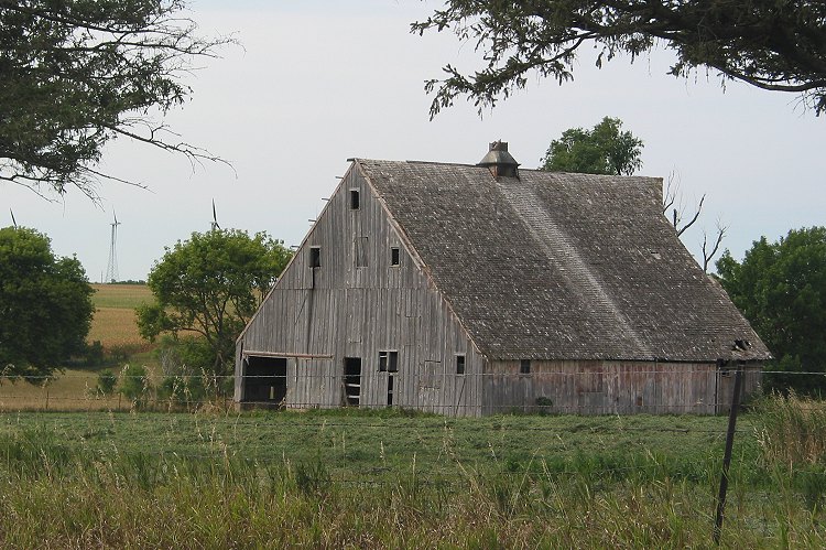 Now riding in the densest concentration of windmills, I stopped to take a few more pictures. Still, no one caught up to me. I turned east, then south. This was perfect--I would have a tailwind for twelve miles, all the way back to Alta. There were some interesting photo opportunities showing the contrast of bucolic farm scenes with modern windmills rising in the background. I got several shots of cattle grazing in front of windmills and another of an old barn. I finally saw riders coming up behind me in the distance, but they never quite reached me.