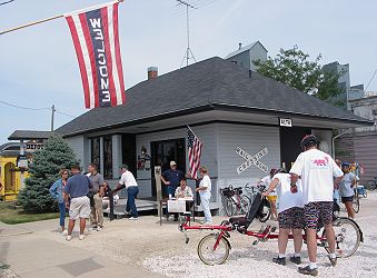When it was time to eat, they asked if I wanted a brat or a tavern. Since the ride poster said brats and burgers, I assumed that a tavern was a burger (like they call them " tavern burgers" at Bennigan's). I asked if I could have both, and they said, " Sure." One of the waitresses promptly served me a brat (actually a cheese brat), hot off the grill. This made up for my disappointment in not getting brats at the Horribly Hilly Hundred in Wisconsin (I thought there was a law requiring brats up there) earlier this year. When Karen brought out my tavern, it turned out that a " tavern" is the local expression for what we in Chicago call a " sloppy joe" --ground beef in a tomato-based sauce on a bun (with a little research, I learned that the sandwich is also variously known as a " charlie boy," " tastee," " maid-rite" or " loosemeat" ). Whatever one called it, it tasted pretty good. I sat around and talked to a few riders. One of them I had seen earlier on a Trek 520, and sure enough he was planning a cross-country trip with an Adventure Cycling Association group next summer. Naturally, we had plenty to talk about. When I found out that Dave the photographer had his mobile " digital photo lab" (basically a big van with a computer and a printer) set up down the block, I went to buy a souvenir picture of myself. We talked for a long time about his photo business, then I headed out of town.
