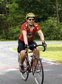 A sag wagon finally came by after I started walking up the hill. I waved it down... but only for water. I couldn't quit now, even if it took me an hour to walk the last three miles up this darn hill. By now, plenty of others were also walking their bikes, except they all looked a lot better than I felt. More people were inquiring about my condition, so I must have looked bad, too. Heck, how could one look good while unsteadily leaning over a bike and staring at the ground? Finally, I walked to the top of the hill. It turned out that there was one decent downhill remaining on the way to the park, so I remounted. However, once again my rapid progress was spoiled by the route's design--a stop sign and a gravelly right turn that forced me to ride the brakes down. After turning carefully (there was a *lot* of gravel), I was on the same road I had driven up in the morning. As usual, it seemed much steeper on a bike than it did in a car. I was walking a lot of it, as were many others. When the road leveled out a bit at the park entrance, I got back on the bike for a while. When the road kicked up again, I stopped once more and walked. Even the now-imminent finish wasn't enough to motivate me to stay on the bike. A few young women were cheering everyone at the 150-yard mark. This was greatly appreciated, and I managed to spin the pedals for a hundred feet or so before walking some more. Finally, at the 50-yard mark I remounted and pedaled to the finish, an exhausted, nearly broken man. The finish clock read 7:00:00. The numbers from my cyclometer: 67.57 miles in 5:42:08 for an average speed of 11.8 mph. I checked the web site months later to see that I finished 47th out of 61 males.