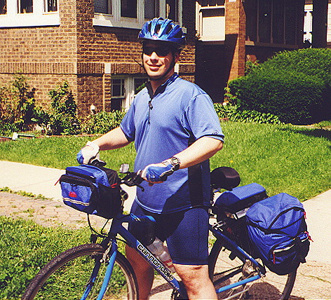 I had a very busy week of preparing for this trip. I probably spent... let's see... $95 for REI panniers, $45 for a rack, $55 for a big REI handlebar bag, $65 for an extra pair of cycling shorts and a raincoat, and maybe $50 for other stuff--film, compass, journal, rearview mirror, maps, electrical tape, etc. Sheesh, that's $300 worth of stuff--as much as my Cannondale H300 hybrid bike cost.